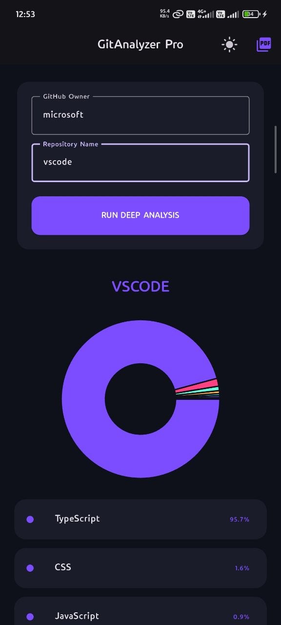 GitAnalyzer Pro is an AI-powered GitHub repository analysis platform that turns raw GitHub data into meaningful insights — instantly. Enter any GitHub username and get a comprehensive breakdown of their public repositories: language distribution, popularity metrics, activity trends, and a downloadable PDF report — all in one clean, modern interface.
