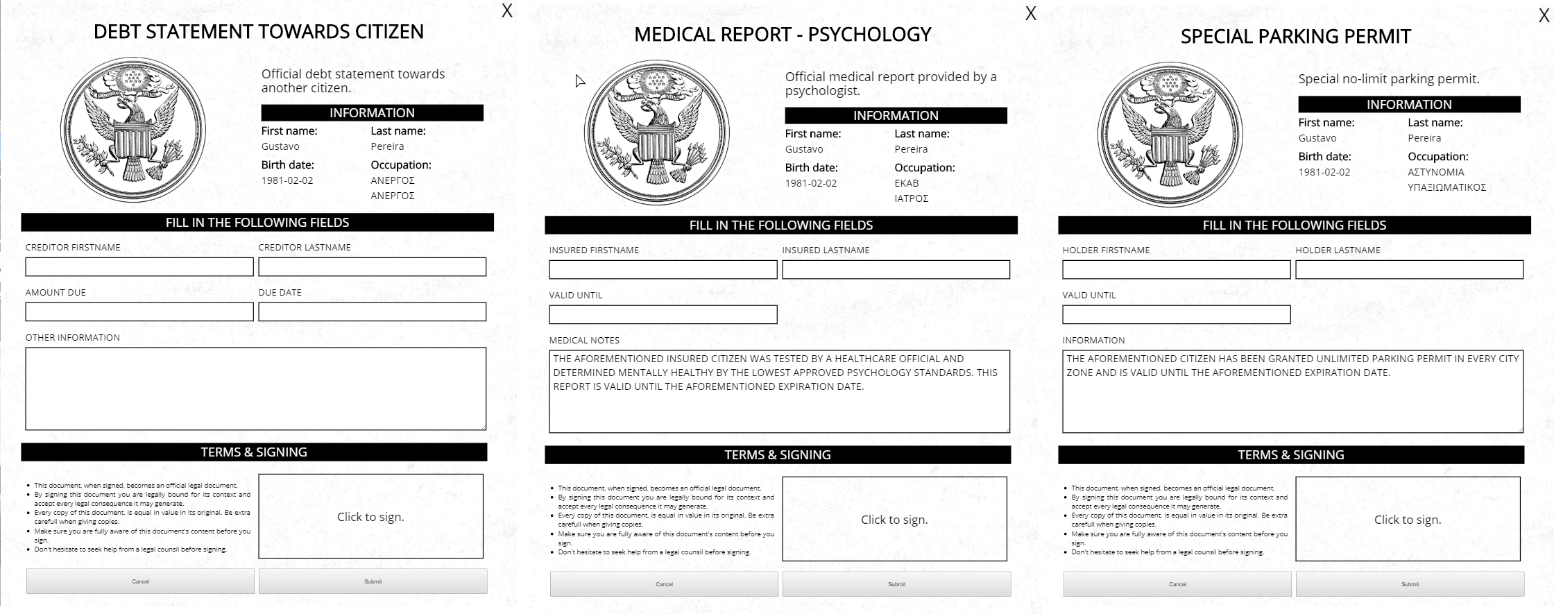 Each document is assigned to a specific category. This category can be public for everyone or a job name to be accessible only by citizens in that specific job. Each document consists of a headerTitle, headerSubtitle and elements. headerTitle and headerSubtitle are self explanatory. Elements are the fields which a user fills in, in a document. An element, so far, can either be input or textarea. Each element has the following properties: