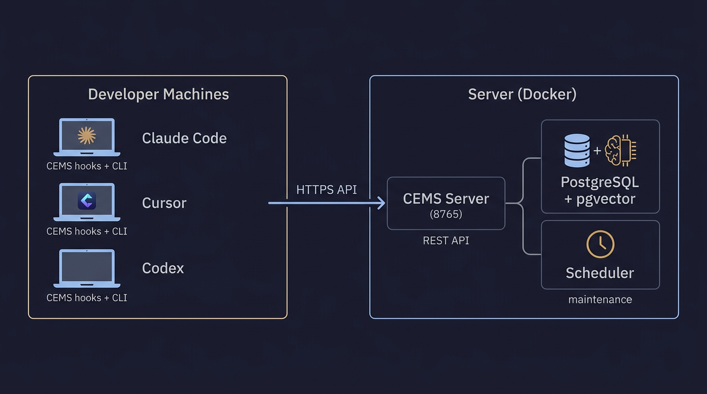 curl -fsSL https://getcems.com/install.sh | bashPrompts for server URL and API key, then configures your IDE. Done.