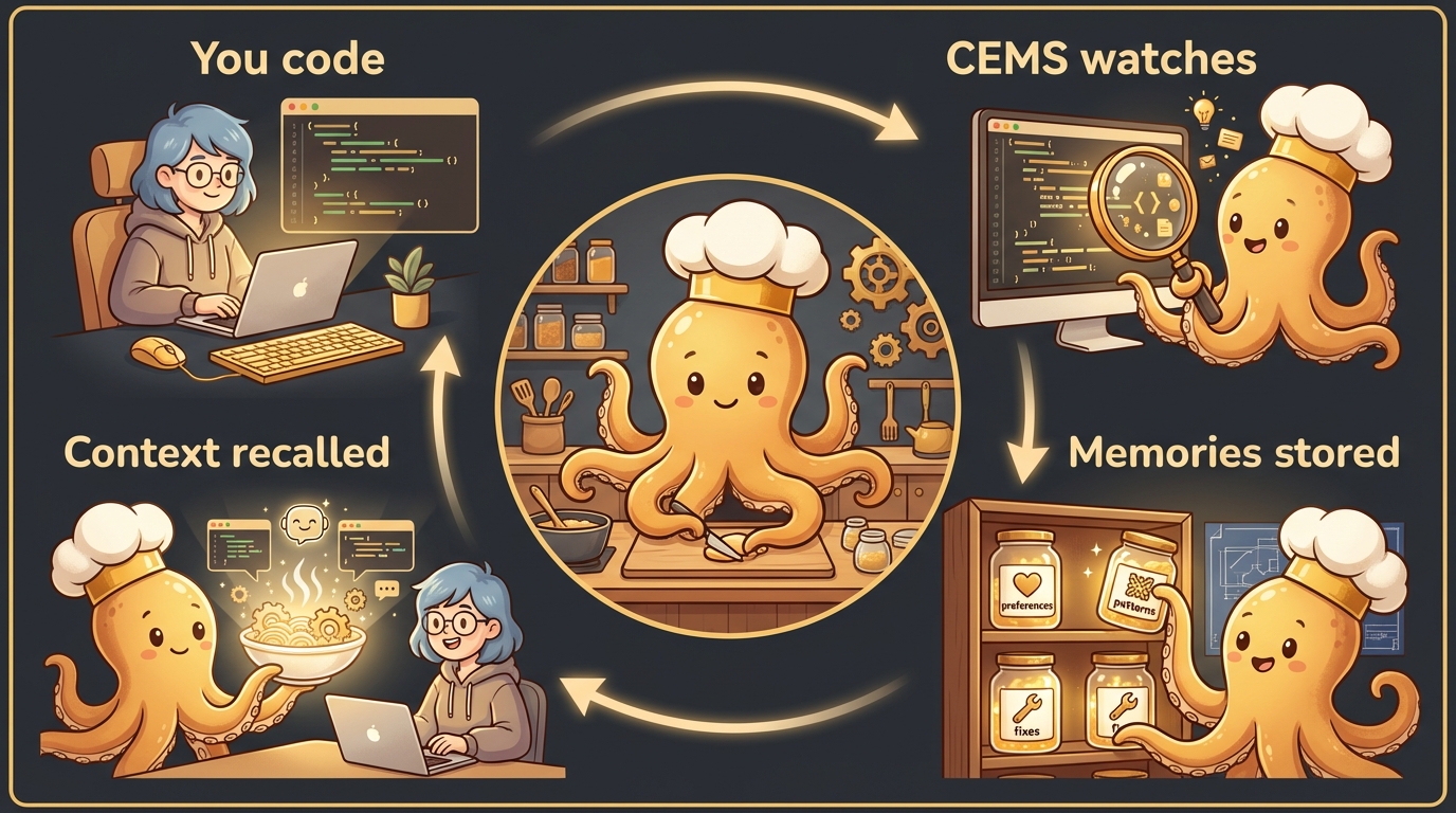 - You code — CEMS hooks into your IDE (Claude Code, Cursor, Codex, Goose)