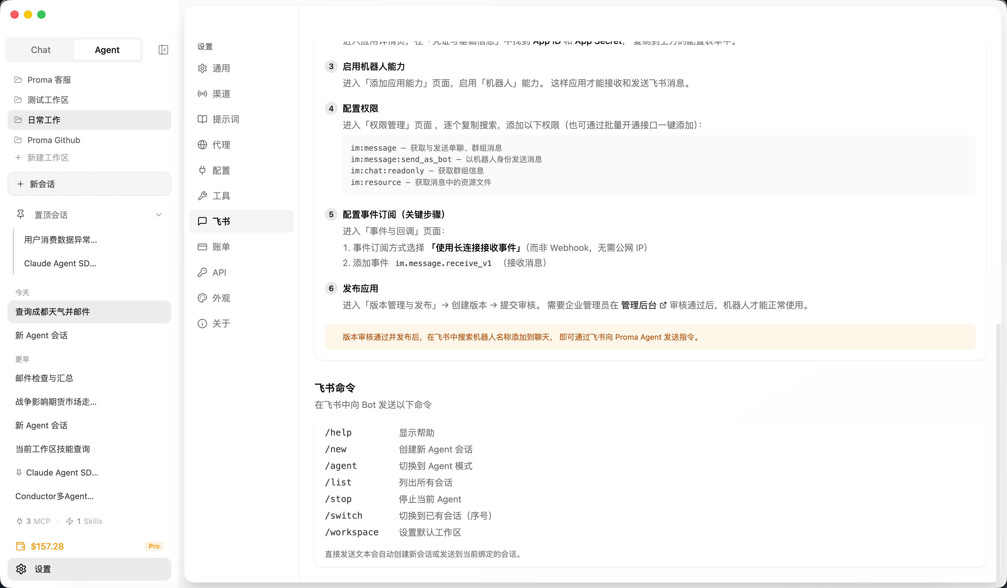Proma 支持通过使用飞书机器人的方式来远程使用 Proma Agent 能力,支持切换工作区(/workspace 命令),支持创建新会话(/new 命令),这样就可以实现类似截图中的效果,可以为不同的工作区先配置上(或直接通过 Proma Agent 来帮你配置)对应的 Skills / MCP 以及文件附录等资源,即可远程也能让 Proma Agent 帮你完成工作。譬如远程帮你进行调研,并将调研文件通过邮件或其他方式发送到同事的邮箱、远程合并 PR 或者修复紧急的 Bug 并推送上线等。