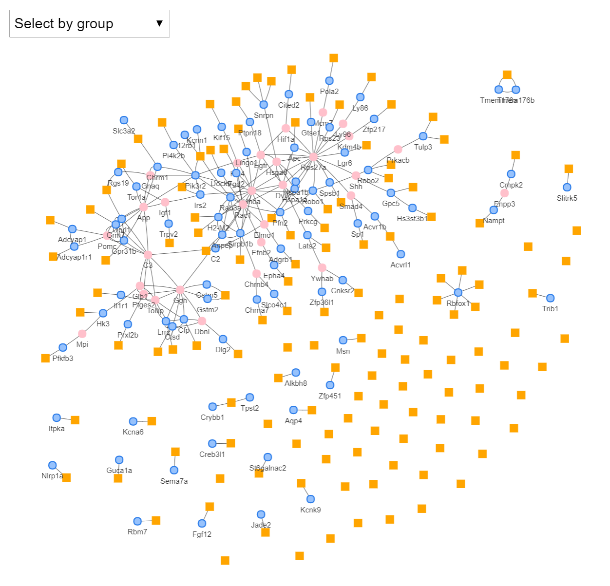 labels <- rbind(labels, x)LErNet allows to visualize the results of the analysis through the use of the package visNetwork. The function visualize takes in input the lncrna context, the list of strict starting proteins, the network seeds, the PPI network, one or more network components extracted by LErNet and the labels.