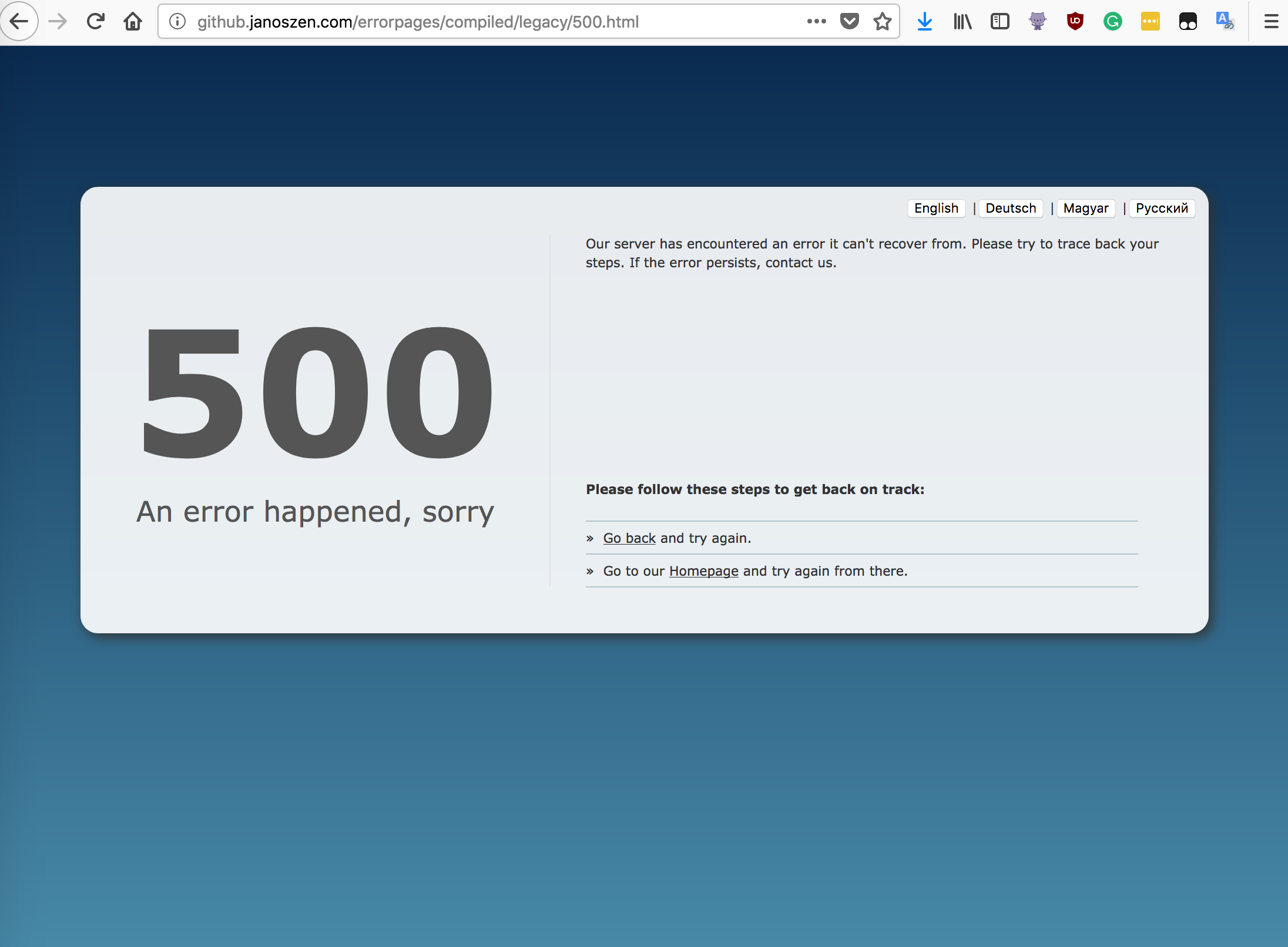- the end user, who simply needs to know that something terrible happened on the server while he was using the app and this is not his fault. He needs to be assisted to recover. Block further user input, big button to reload the page and try again.