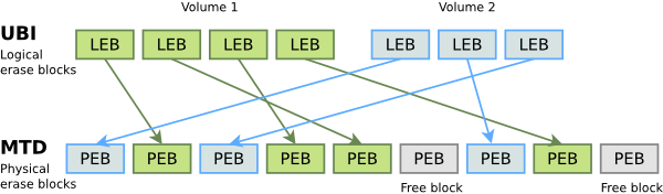 UBI is a layer on top of MTD which takes care of managing erase blocks, implementing wear leveling and bad block management on the whole device. This way, upper layers no longer have to take care of these tasks by themselves. UBI also supports flexible partitions or volumes, which can be created and resized dynamically, in a way that is similar to the Logical Volume Manager for block devices.
