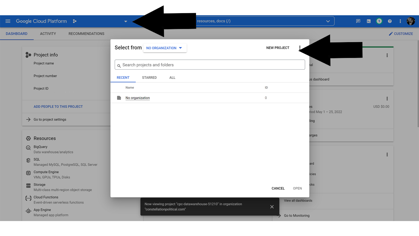 Selecting or creating a project is easily done from the drop-down on the top-left next to the 'Google Cloud Platform' text. Once you've created your project make sure you're working in it by ensuring the correct project name appears next to the drop-down you just selected.