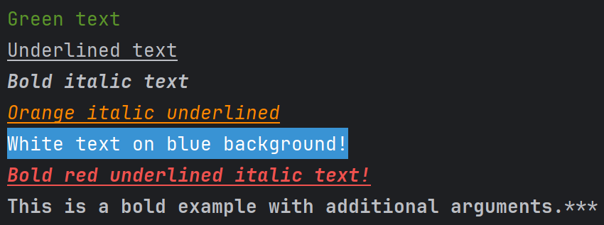 ap.print()method to print colored text.# Example usage ap.print("Green text", c="green") ap.print("Underlined text", s="u") ap.print("Bold italic text", s="b-it") ap.print("Orange italic underlined", s="it-u", c='orange') ap.print("White text on blue b!", c="white", b="blue") ap.print("Bold red underlined italic text!", c="red", s="b-it-u") # Additional arguments example ap.print("This is a bold example with additional arguments.", s="b", end="***")