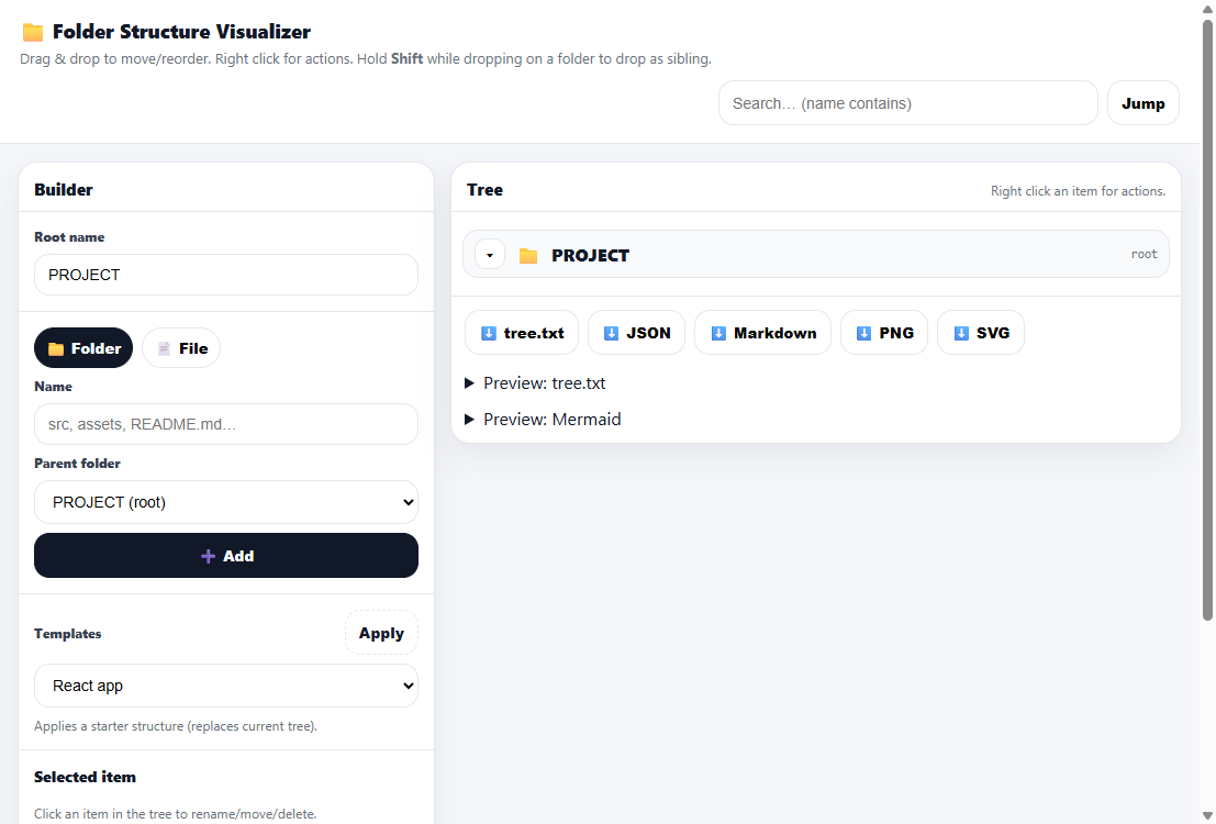 Build a folder structure, reorganize it with true drag & drop, and export a polished diagram for README files, pitches, docs, or planning.