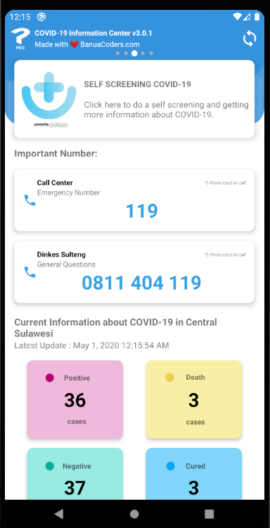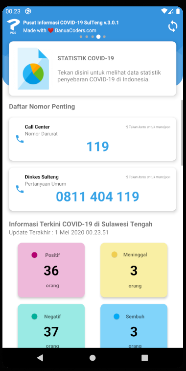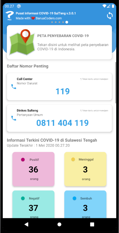 PICO SulTeng (Pusat Informasi COVID-19 Sulawesi Tengah/COVID-19 Information Center of Central Sulawesi) is an android-based application developed to facilitate the people of Central Sulawesi in obtaining information about the current situation of COVID-19 in Central Sulawesi.