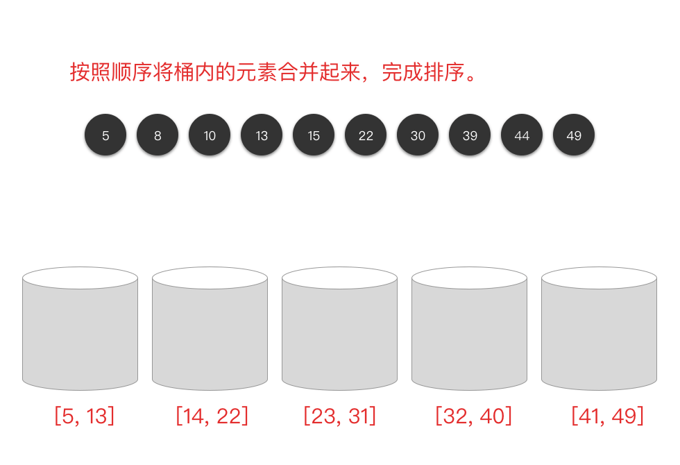 - 最后按照区间顺序将桶内的元素合并起来,完成排序。