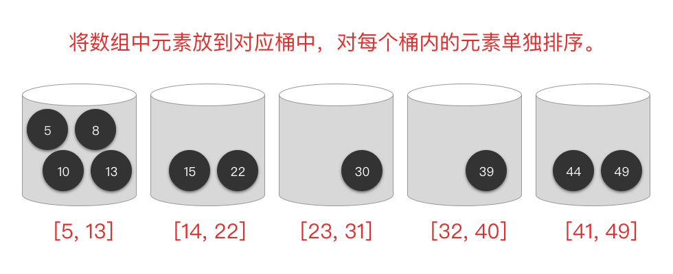 # 遍历原始数组元素,将每个元素装入对应区间的桶中