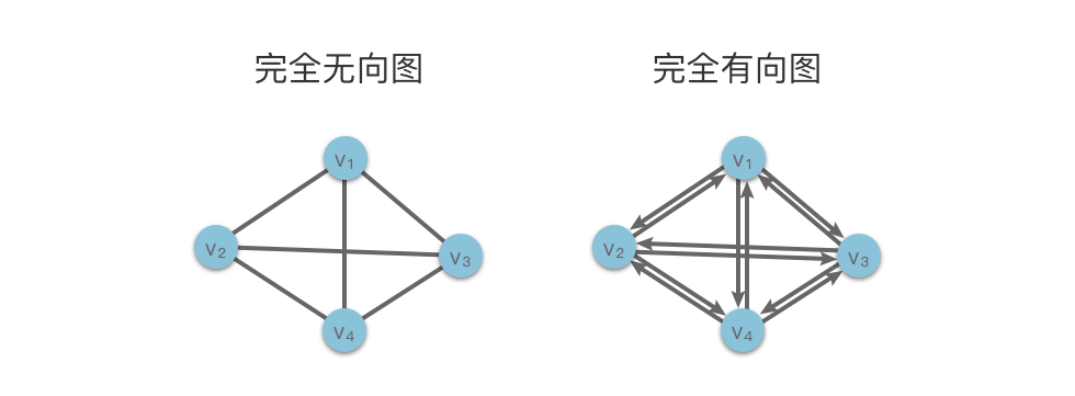 如下图所示,左侧为包含 4 个顶点的完全无向图,右侧为包含 4 个顶点的完全有向图。